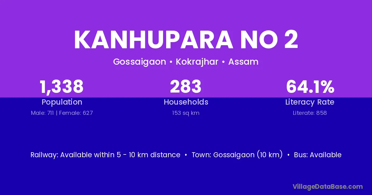 Gossaigaon (10 km) is the nearest town to Kanhupara No 2 village for major economic activities and is located approximately 10 km away.