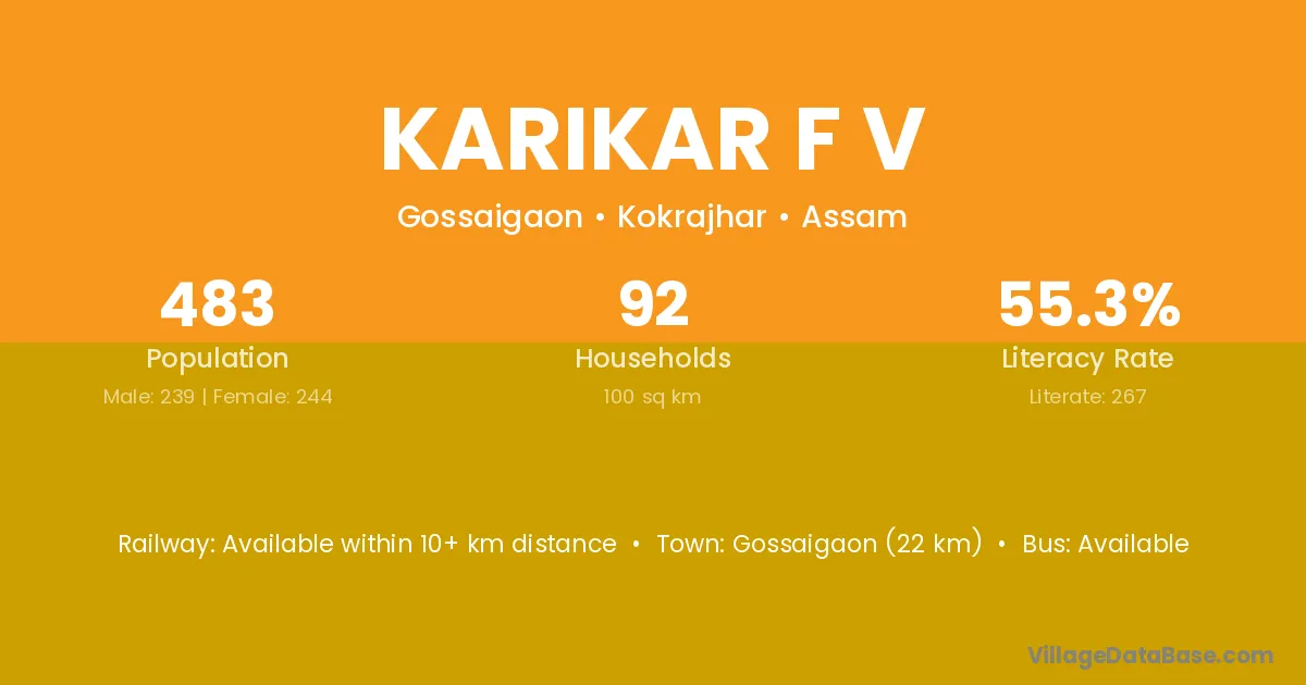 Gossaigaon (22 km) is the nearest town to Karikar F V village for major economic activities and is located approximately 22 km away.