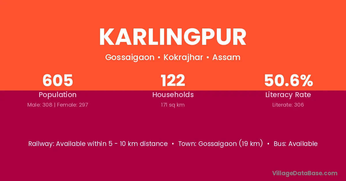 Gossaigaon (19 km) is the nearest town to Karlingpur village for major economic activities and is located approximately 19 km away.