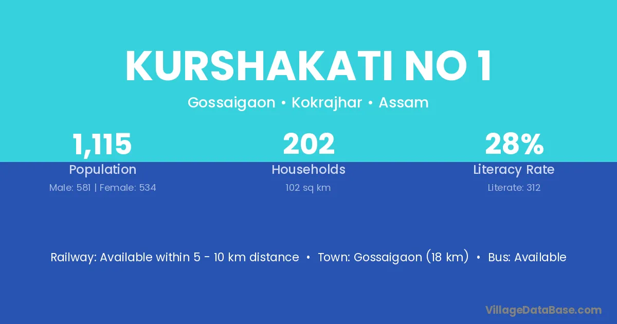 Gossaigaon (18 km) is the nearest town to Kurshakati No 1 village for major economic activities and is located approximately 18 km away.