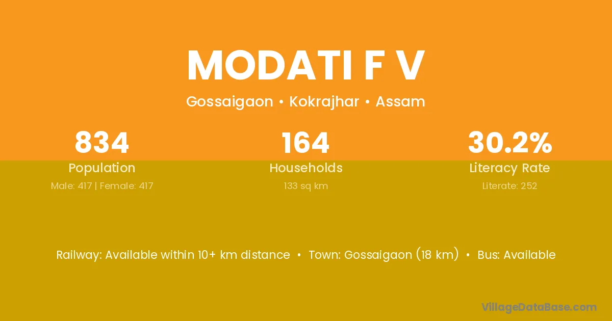 Gossaigaon (18 km) is the nearest town to Modati F V village for major economic activities and is located approximately 18 km away.