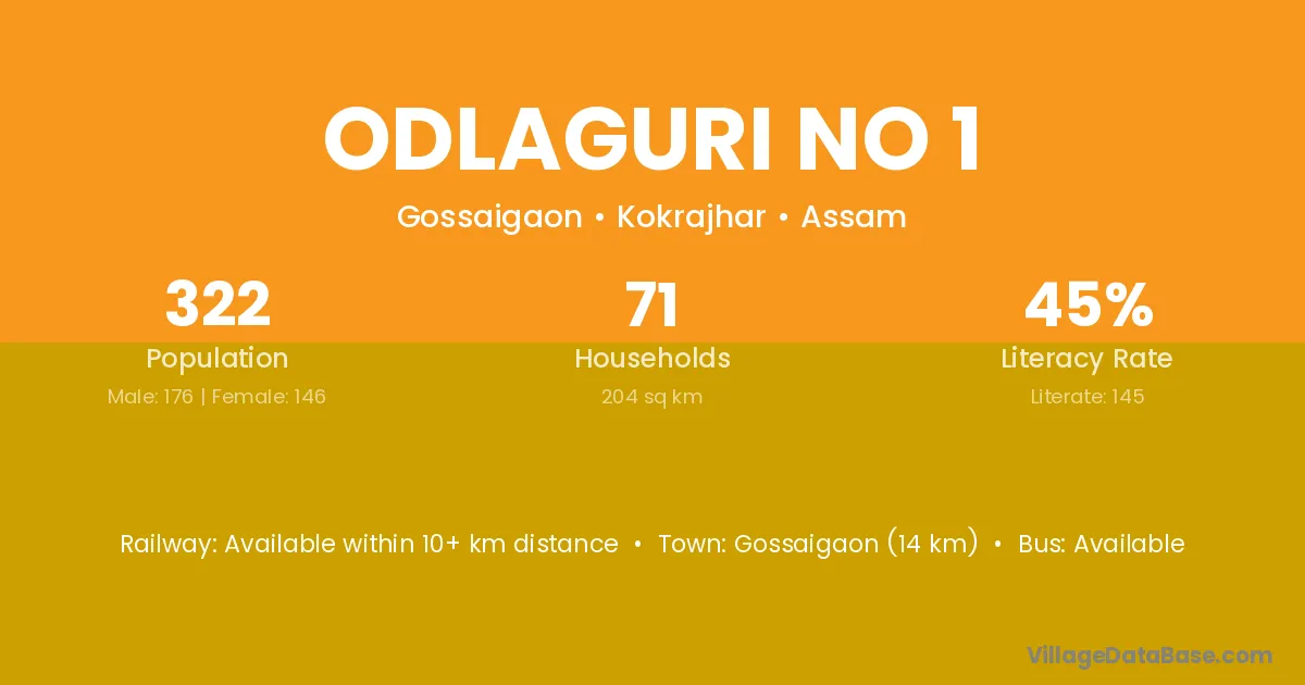 Gossaigaon (14 km) is the nearest town to Odlaguri No 1 village for major economic activities and is located approximately 14 km away.