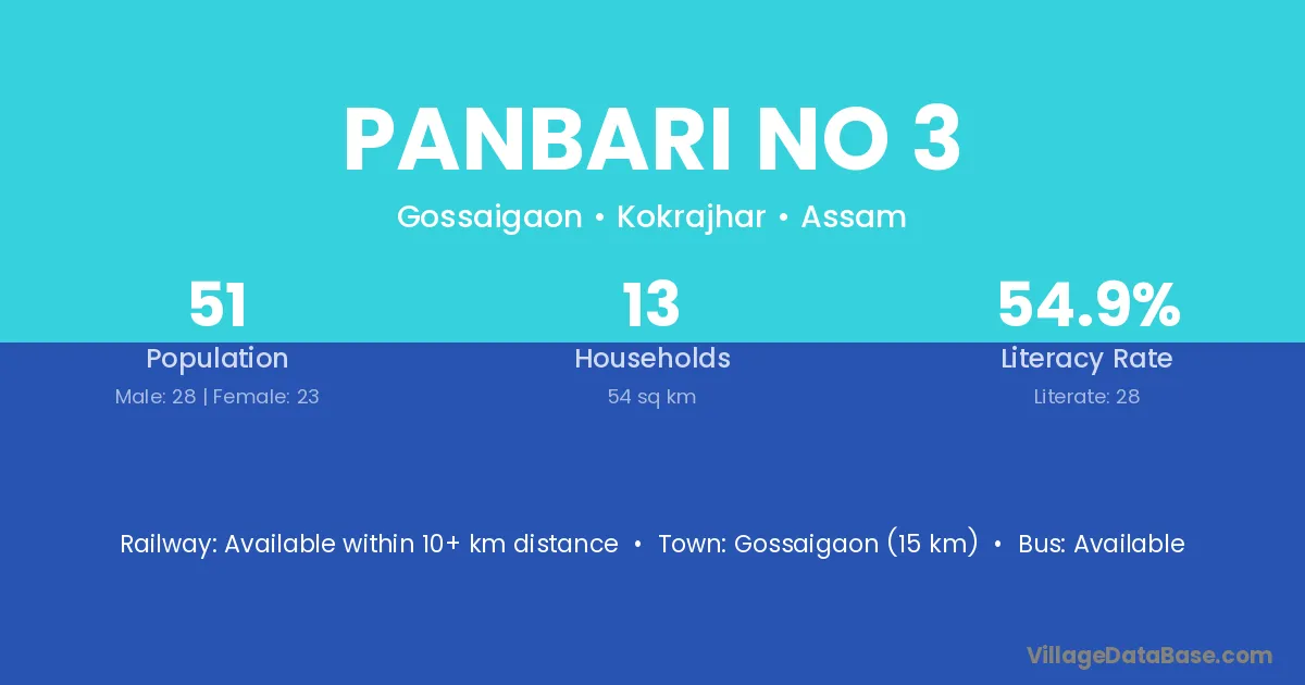 Gossaigaon (15 km) is the nearest town to Panbari No 3 village for major economic activities and is located approximately 15 km away.