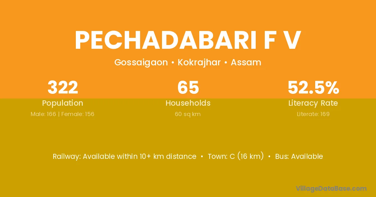 C (16 km) is the nearest town to Pechadabari F V village for major economic activities and is located approximately 16 km away.
