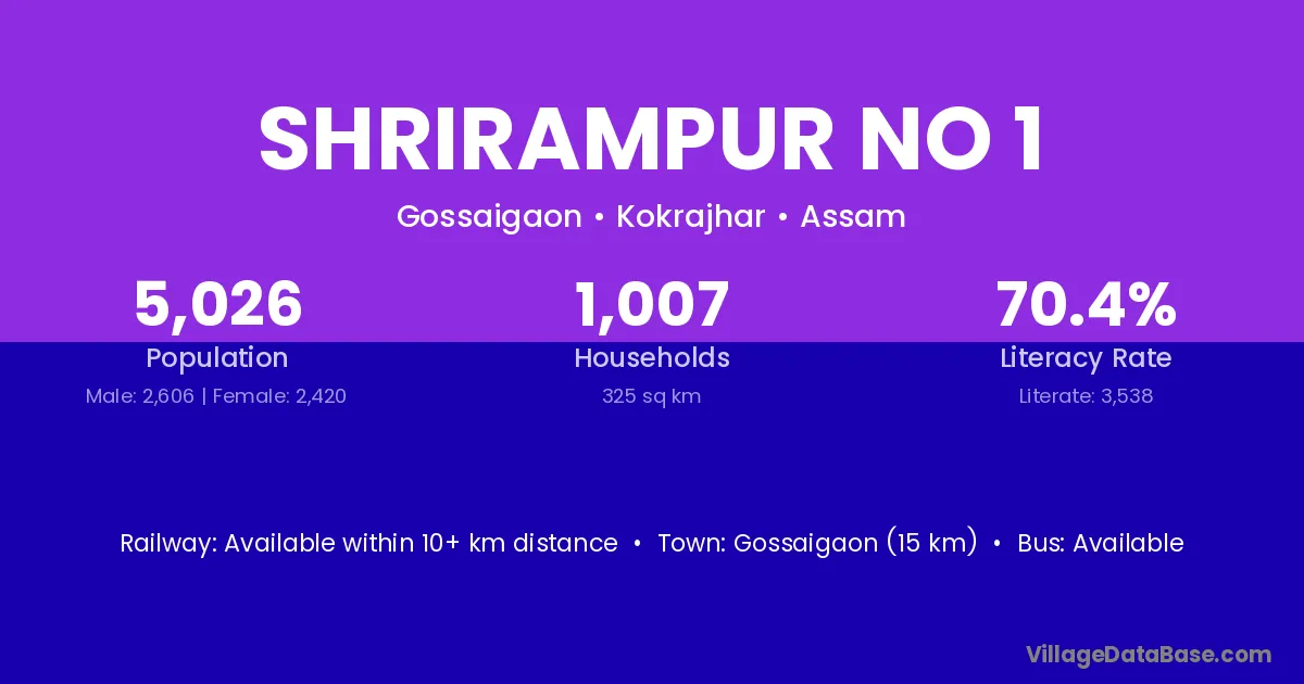 Gossaigaon (15 km) is the nearest town to Shrirampur No 1 village for major economic activities and is located approximately 15 km away.