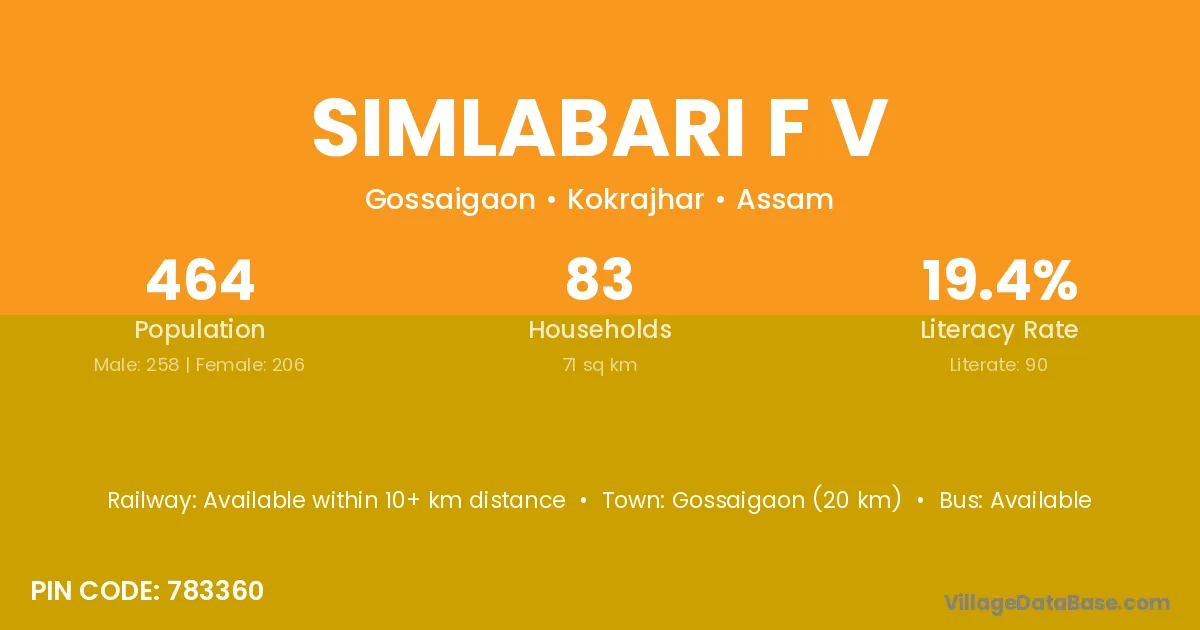 Gossaigaon (20 km) is the nearest town to Simlabari F V village for major economic activities and is located approximately 20 km away.
