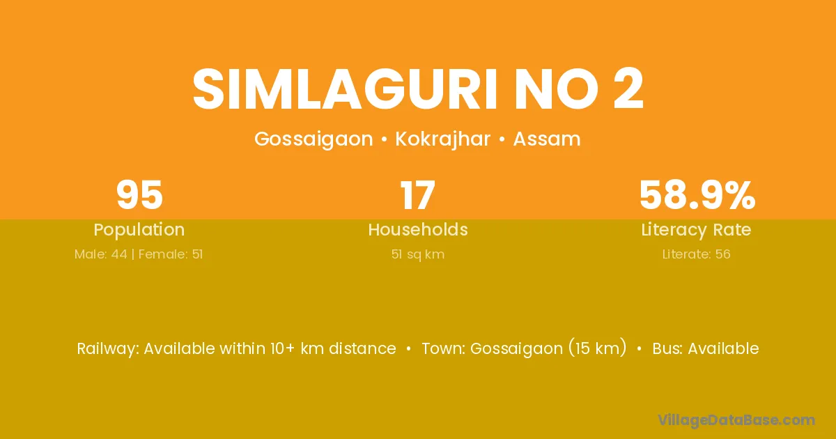 Simlaguri No 2 village has a total population of 95 people, of which 44 are males and 51 are females.