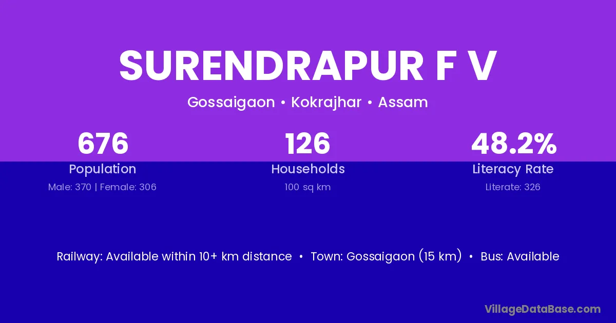Gossaigaon (15 km) is the nearest town to Surendrapur F V village for major economic activities and is located approximately 15 km away.