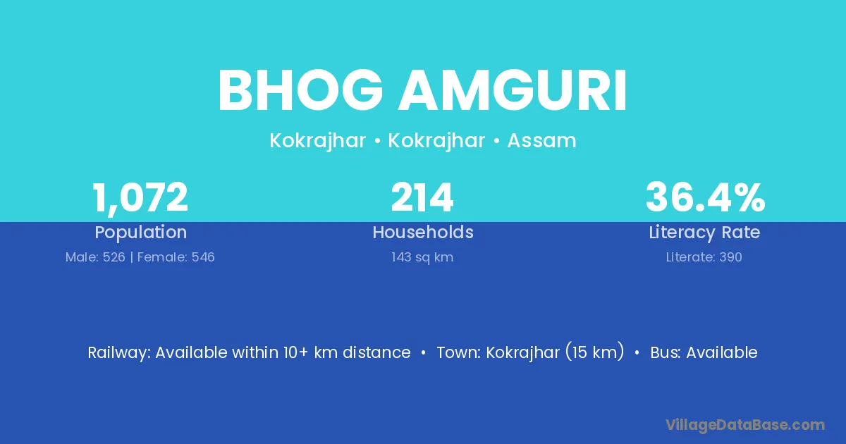 Kokrajhar (15 km) is the nearest town to Bhog Amguri village for major economic activities and is located approximately 15 km away.