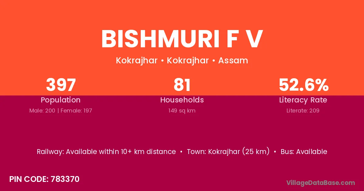 Kokrajhar (25 km) is the nearest town to Bishmuri F V village for major economic activities and is located approximately 25 km away.