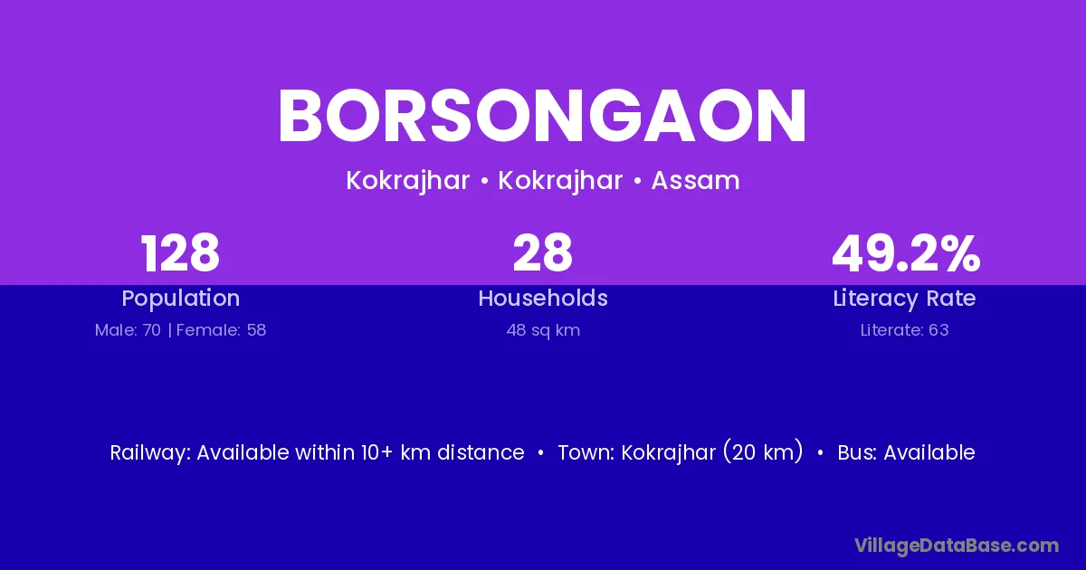 Kokrajhar (20 km) is the nearest town to Borsongaon village for major economic activities and is located approximately 20 km away.