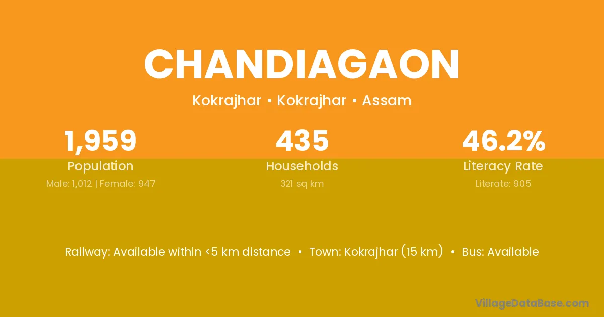 Kokrajhar (15 km) is the nearest town to Chandiagaon village for major economic activities and is located approximately 15 km away.