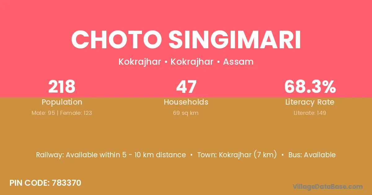 Kokrajhar (7 km) is the nearest town to Choto Singimari village for major economic activities and is located approximately 7 km away.