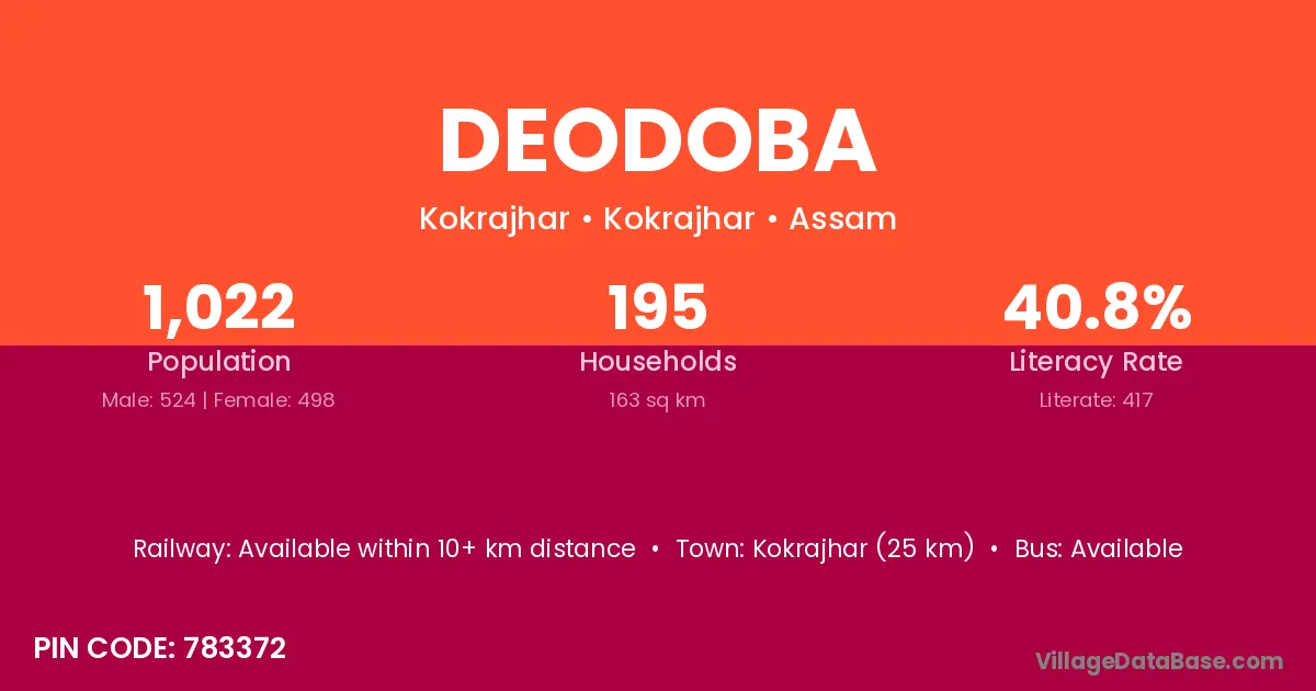 Kokrajhar (25 km) is the nearest town to Deodoba village for major economic activities and is located approximately 25 km away.