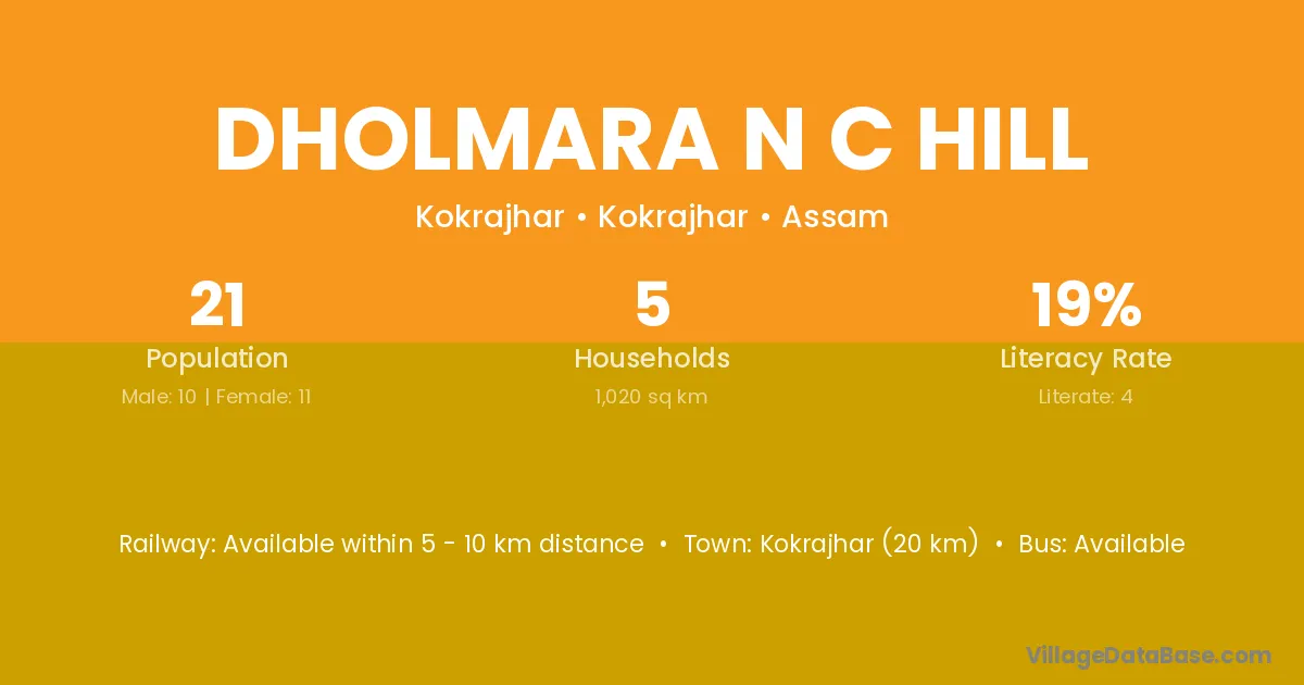 Kokrajhar (20 km) is the nearest town to Dholmara N C Hill village for major economic activities and is located approximately 20 km away.