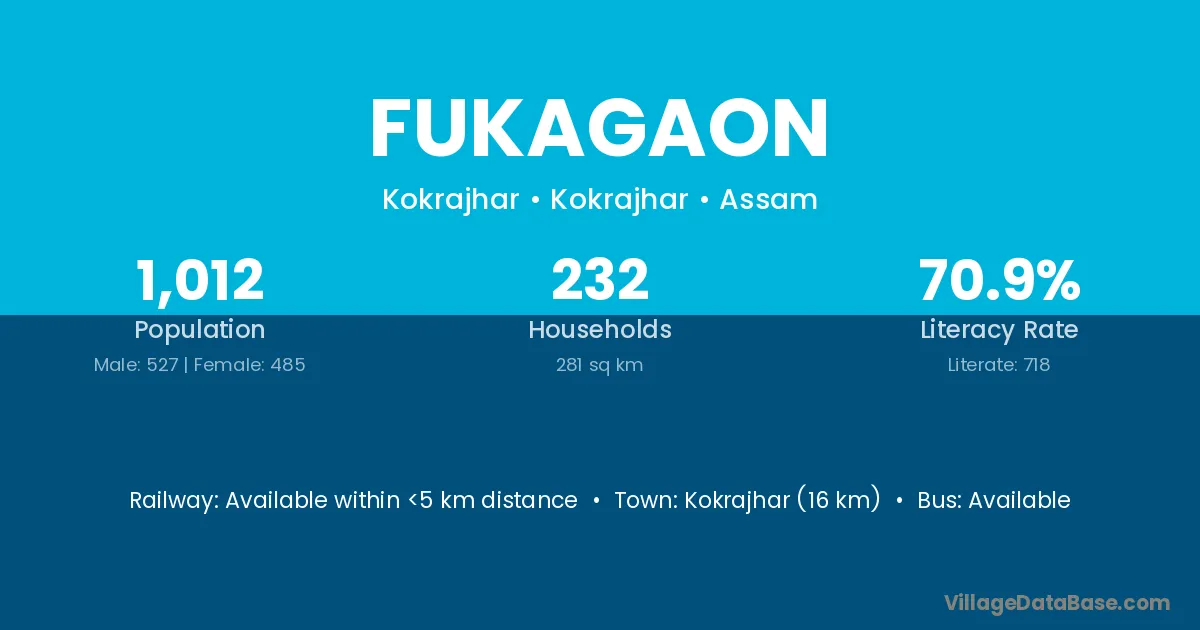 Kokrajhar (16 km) is the nearest town to Fukagaon village for major economic activities and is located approximately 16 km away.