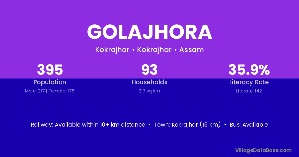 Kokrajhar (16 km) is the nearest town to Golajhora village for major economic activities and is located approximately 16 km away.