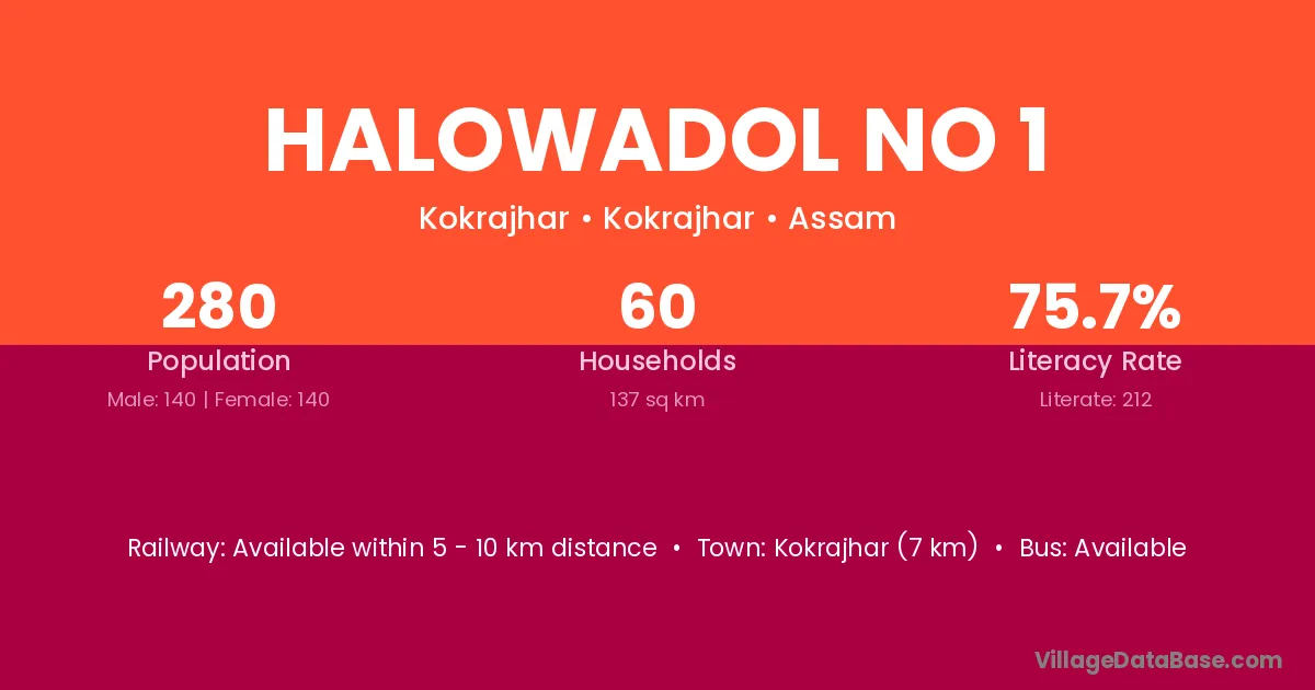 Kokrajhar (7 km) is the nearest town to Halowadol No 1 village for major economic activities and is located approximately 7 km away.