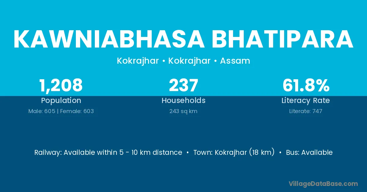 Kawniabhasa Bhatipara village has a total population of 1,208 people, of which 605 are males and 603 are females.