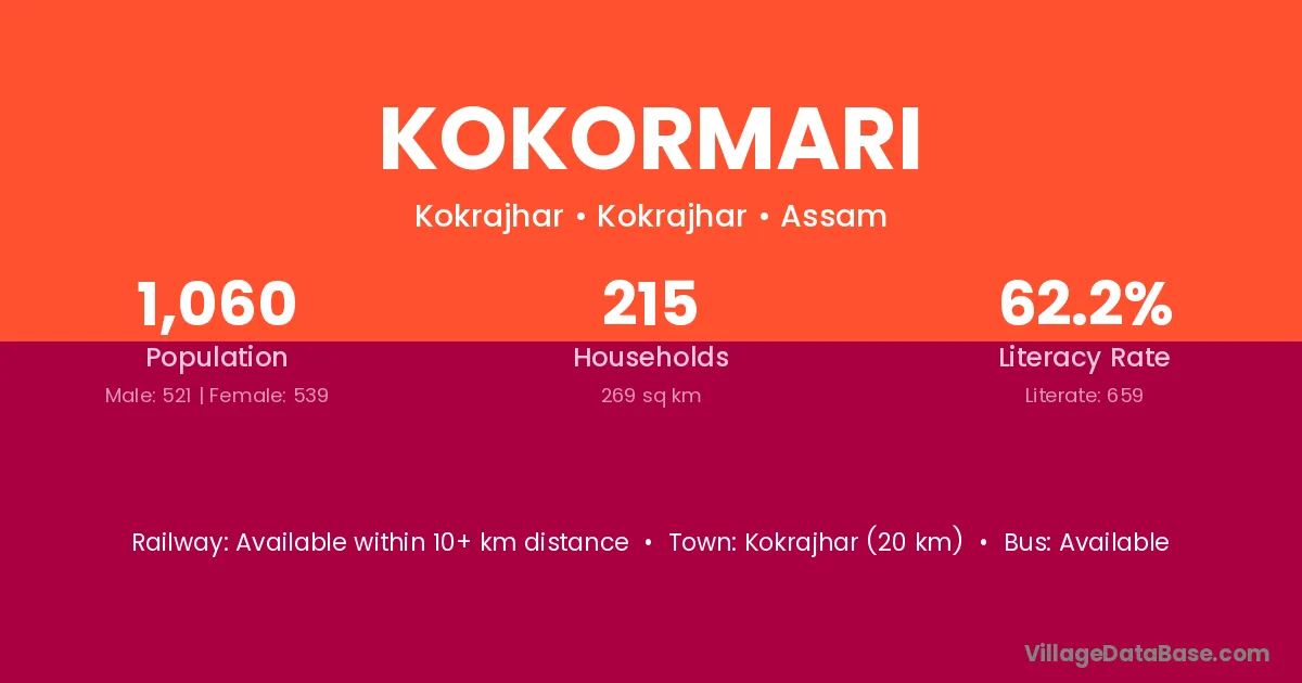 Kokrajhar (20 km) is the nearest town to Kokormari village for major economic activities and is located approximately 20 km away.