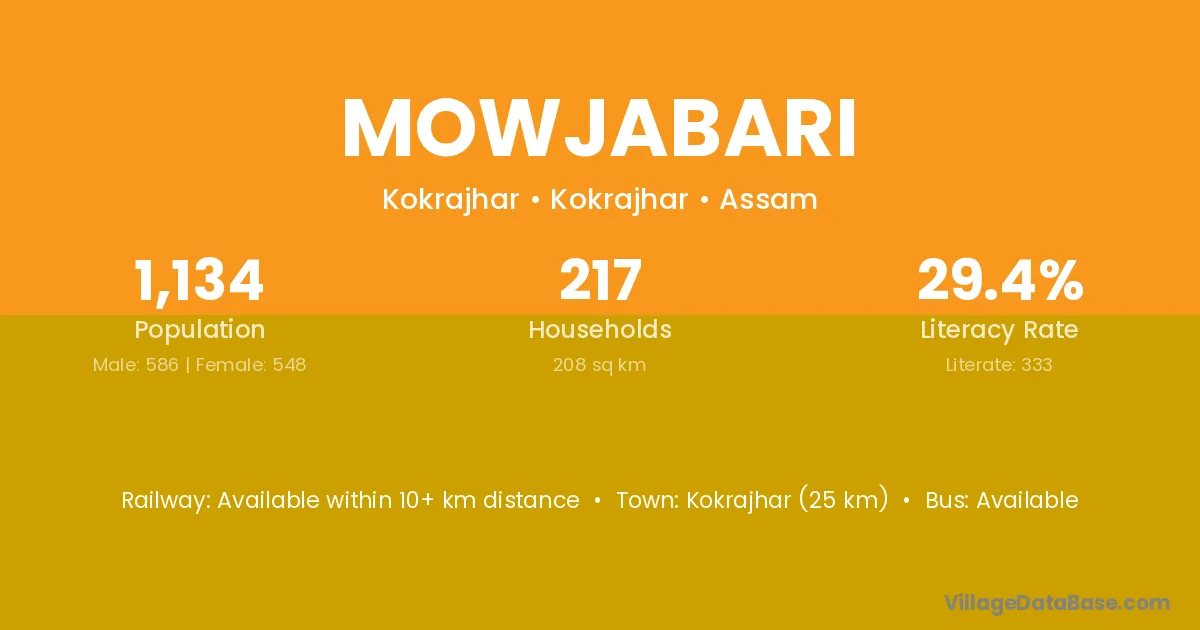Kokrajhar (25 km) is the nearest town to Mowjabari village for major economic activities and is located approximately 25 km away.
