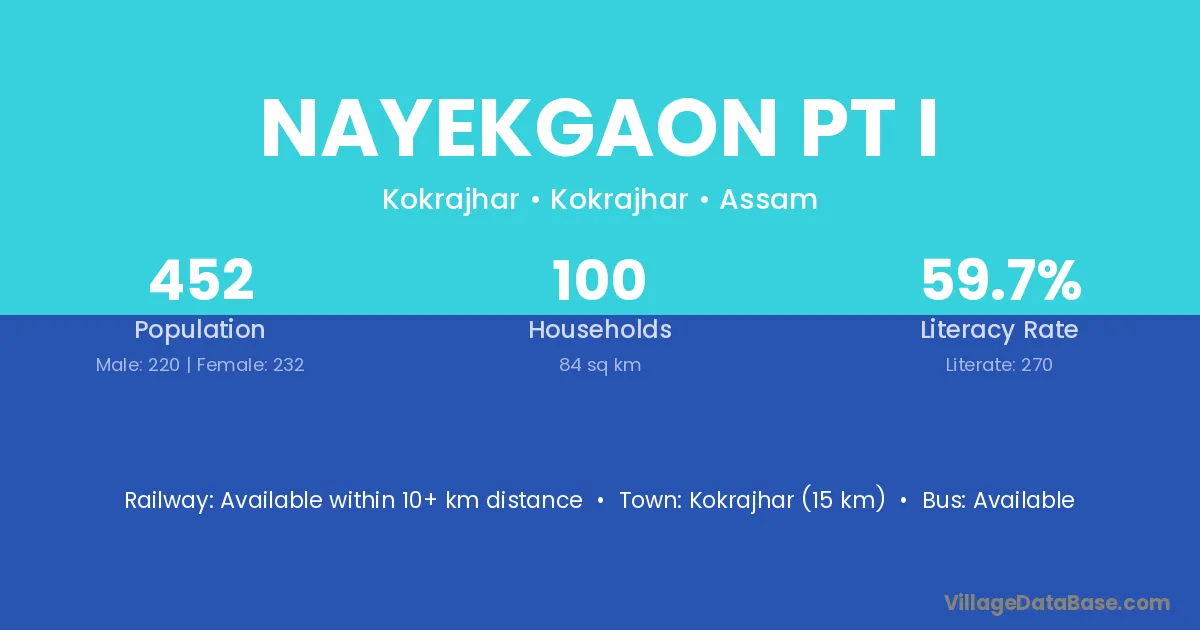 Kokrajhar (15 km) is the nearest town to Nayekgaon Pt I village for major economic activities and is located approximately 15 km away.