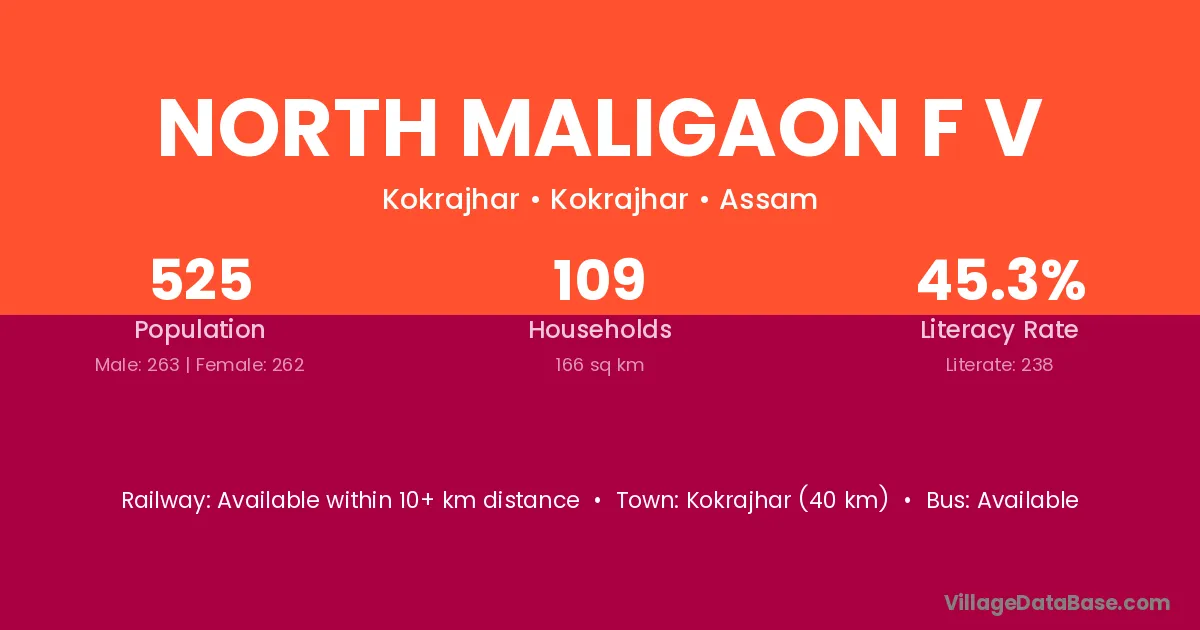 North Maligaon F V village has a total population of 525 people, of which 263 are males and 262 are females.