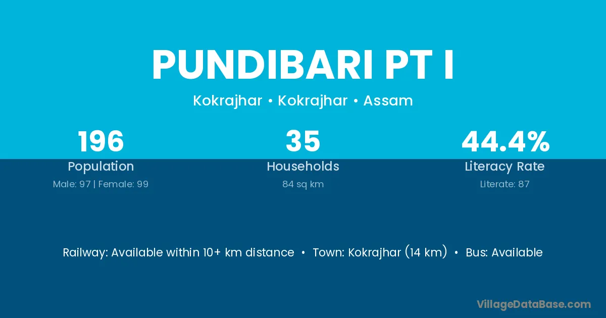 Kokrajhar (14 km) is the nearest town to Pundibari Pt I village for major economic activities and is located approximately 14 km away.