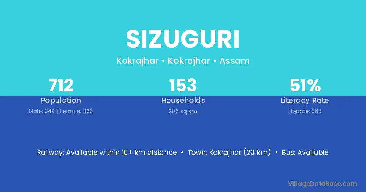 Kokrajhar (23 km) is the nearest town to Sizuguri village for major economic activities and is located approximately 23 km away.