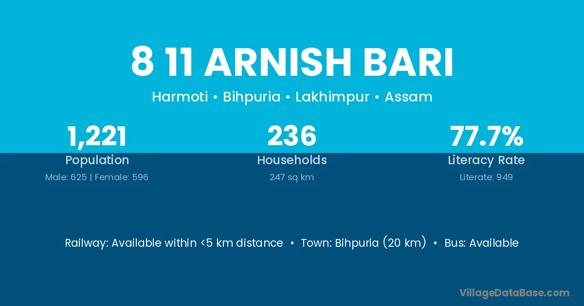 Bihpuria (20 km) is the nearest town to 8 11 Arnish Bari village for major economic activities and is located approximately 20 km away.