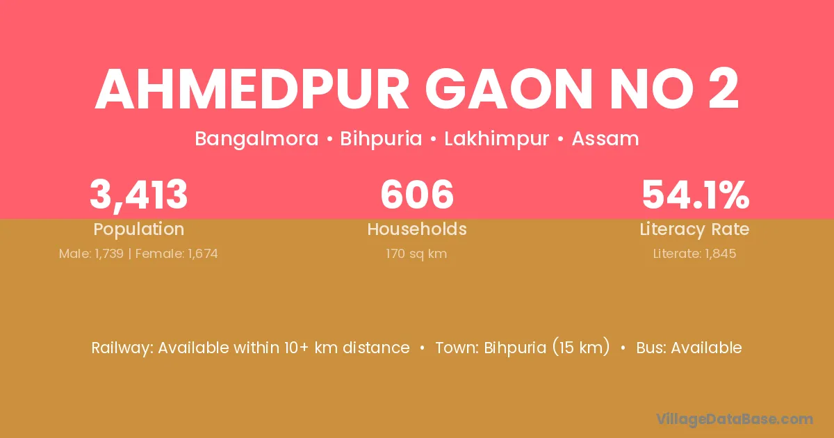 Ahmedpur Gaon No 2 village has a total population of 3,413 people, of which 1,739 are males and 1,674 are females.