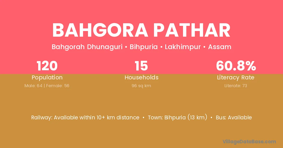 Bihpuria (13 km) is the nearest town to Bahgora Pathar village for major economic activities and is located approximately 13 km away.