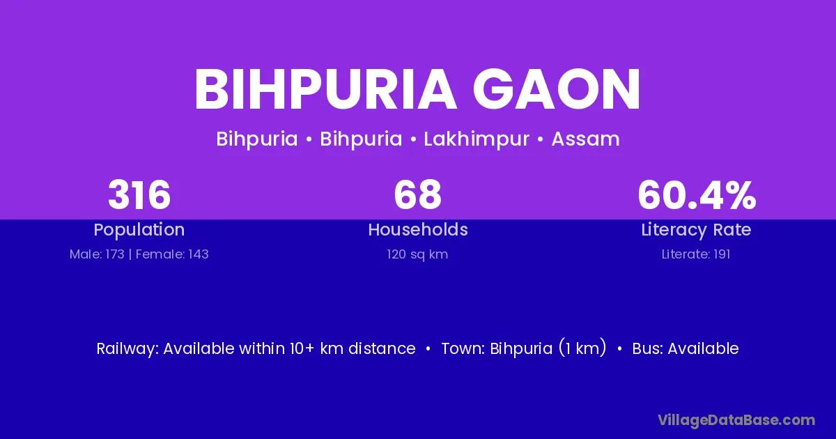 Bihpuria Gaon village has a total population of 316 people, of which 173 are males and 143 are females.