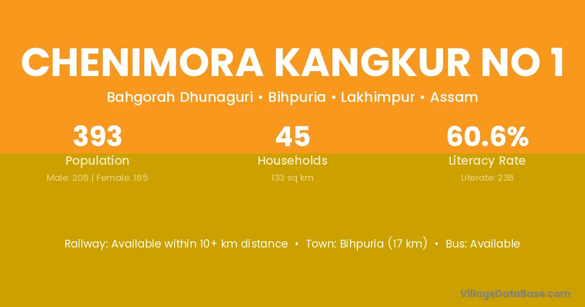 Chenimora Kangkur No 1 village has a total population of 393 people, of which 208 are males and 185 are females.