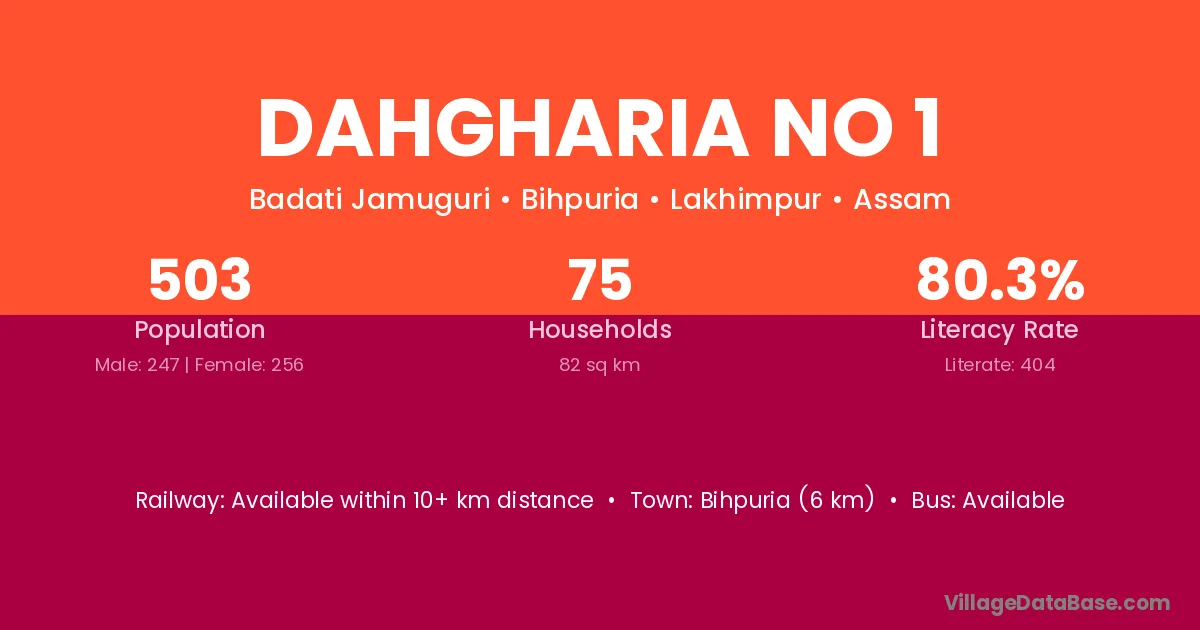 Bihpuria (6 km) is the nearest town to Dahgharia No 1 village for major economic activities and is located approximately 6 km away.