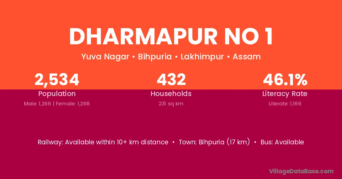 Bihpuria (17 km) is the nearest town to Dharmapur No 1 village for major economic activities and is located approximately 17 km away.