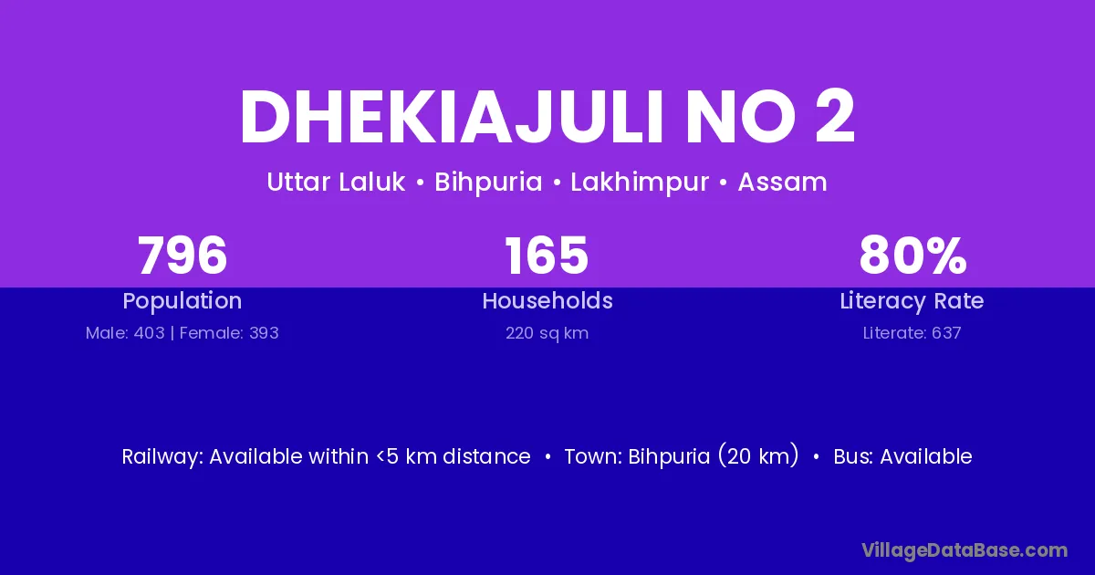 Bihpuria (20 km) is the nearest town to Dhekiajuli No 2 village for major economic activities and is located approximately 20 km away.