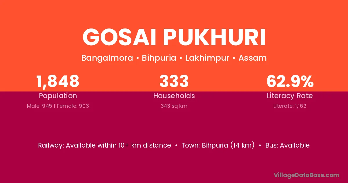 Gosai Pukhuri village has a total population of 1,848 people, of which 945 are males and 903 are females.
