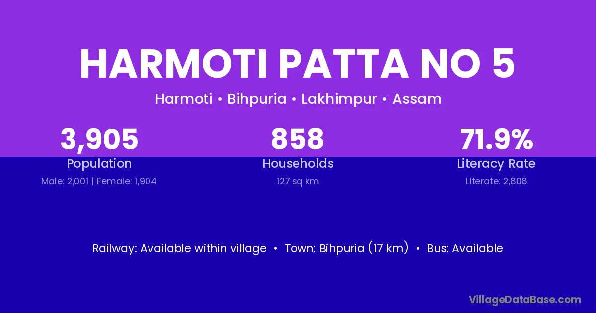 Harmoti Patta No 5 village has a total population of 3,905 people, of which 2,001 are males and 1,904 are females.