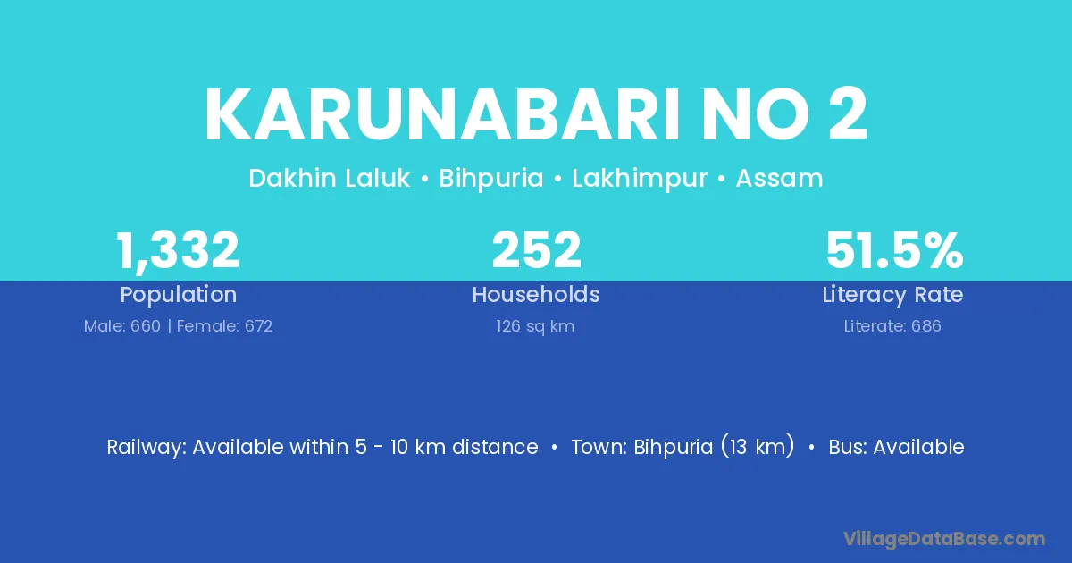 Bihpuria (13 km) is the nearest town to Karunabari No 2 village for major economic activities and is located approximately 13 km away.