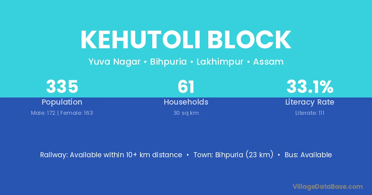 Bihpuria (23 km) is the nearest town to Kehutoli Block village for major economic activities and is located approximately 23 km away.