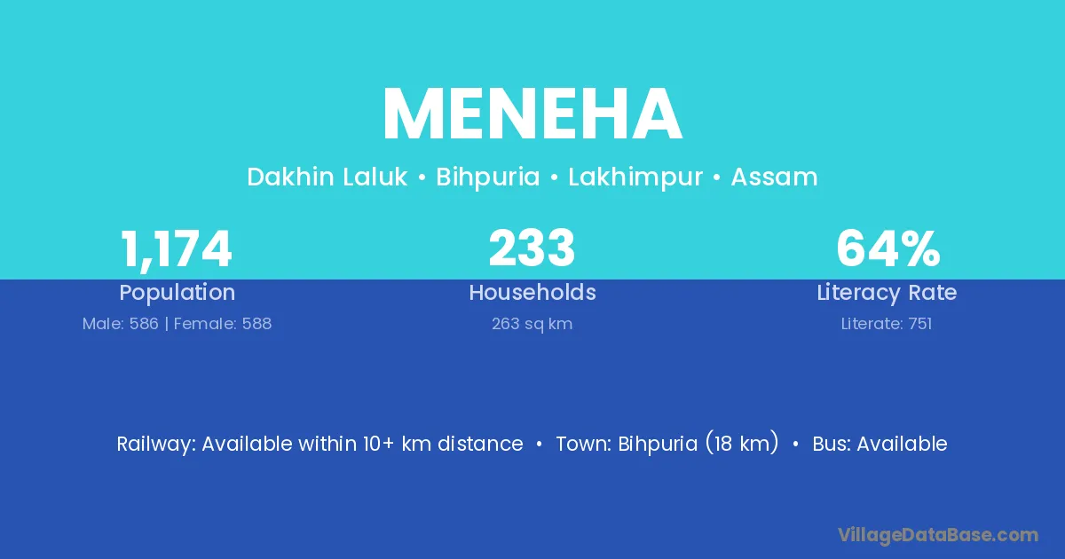 Bihpuria (18 km) is the nearest town to Meneha village for major economic activities and is located approximately 18 km away.