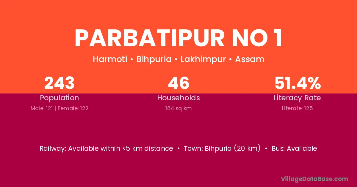 Bihpuria (20 km) is the nearest town to Parbatipur No 1 village for major economic activities and is located approximately 20 km away.