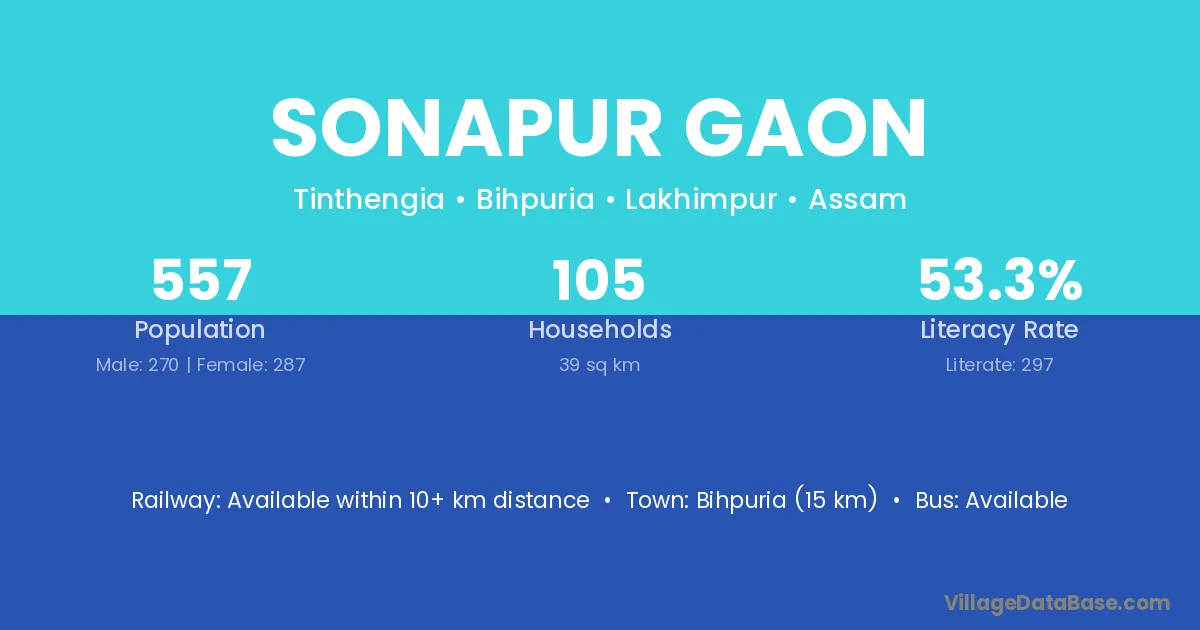 Bihpuria (15 km) is the nearest town to Sonapur Gaon village for major economic activities and is located approximately 15 km away.