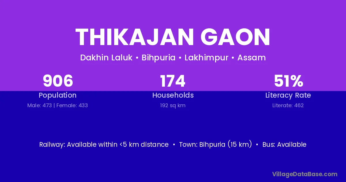 Thikajan Gaon village has a total population of 906 people, of which 473 are males and 433 are females.