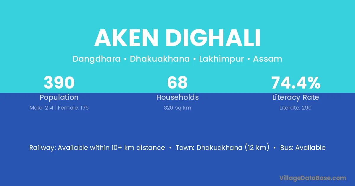 Dhakuakhana (12 km) is the nearest town to Aken Dighali village for major economic activities and is located approximately 12 km away.