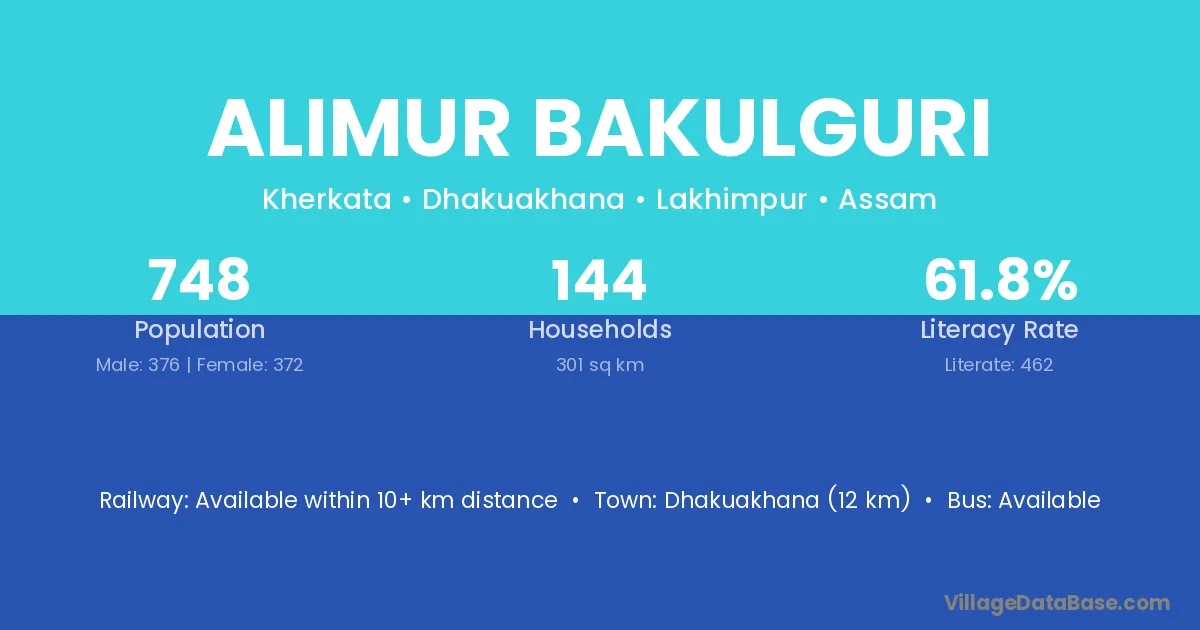 Dhakuakhana (12 km) is the nearest town to Alimur Bakulguri village for major economic activities and is located approximately 12 km away.