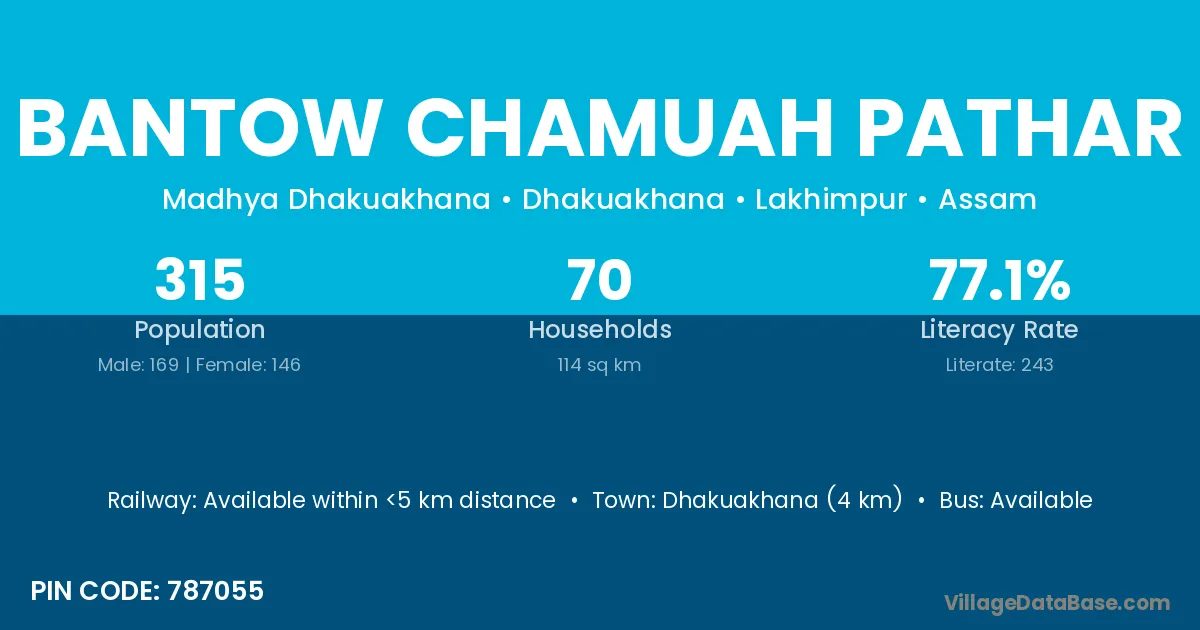 Dhakuakhana (4 km) is the nearest town to Bantow Chamuah Pathar village for major economic activities and is located approximately 4 km away.