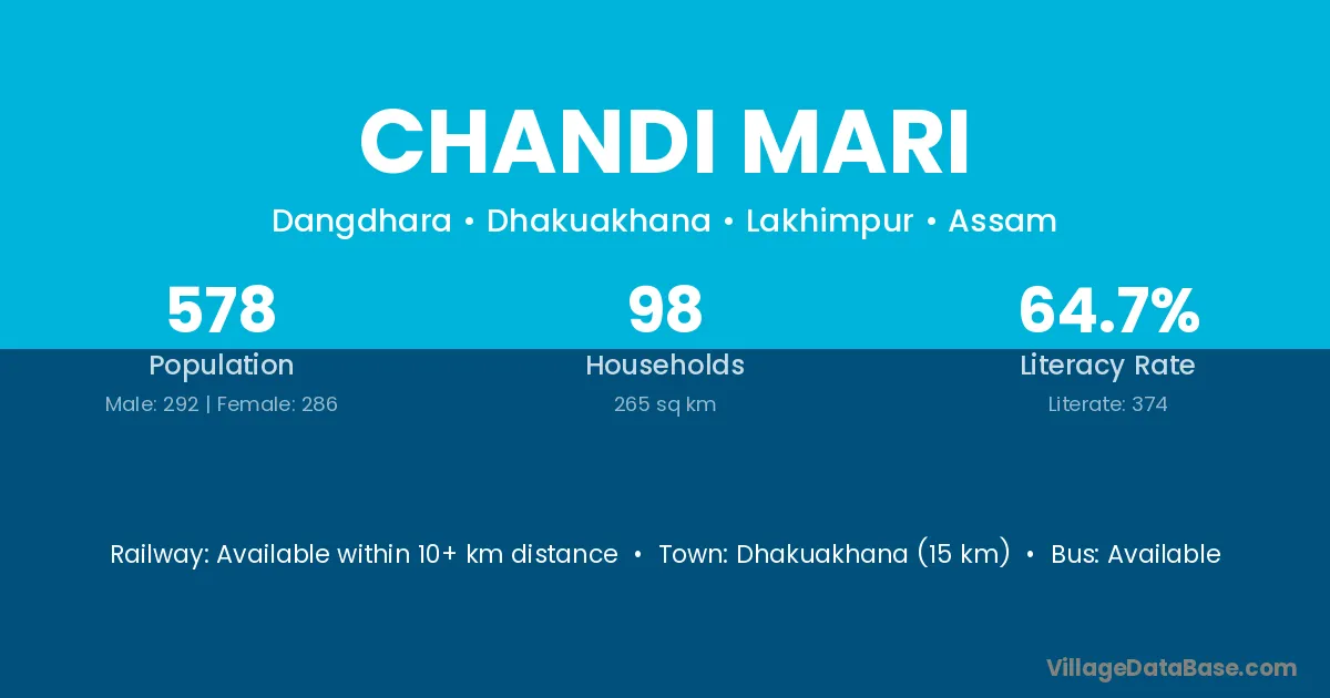 Dhakuakhana (15 km) is the nearest town to Chandi Mari village for major economic activities and is located approximately 15 km away.