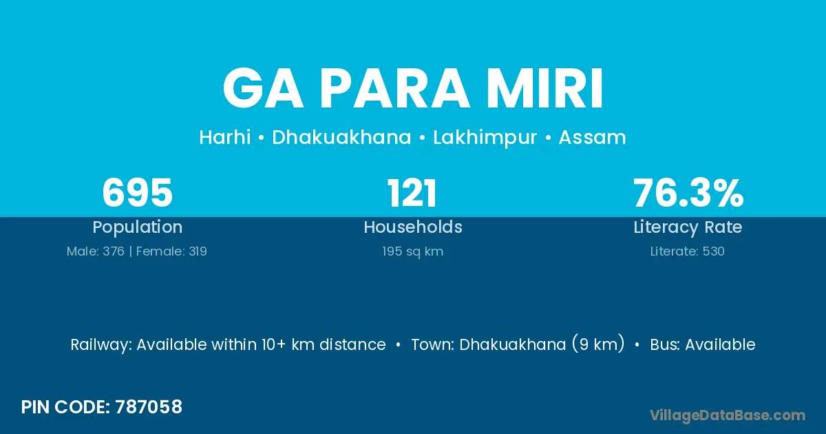 Dhakuakhana (9 km) is the nearest town to Ga Para Miri village for major economic activities and is located approximately 9 km away.